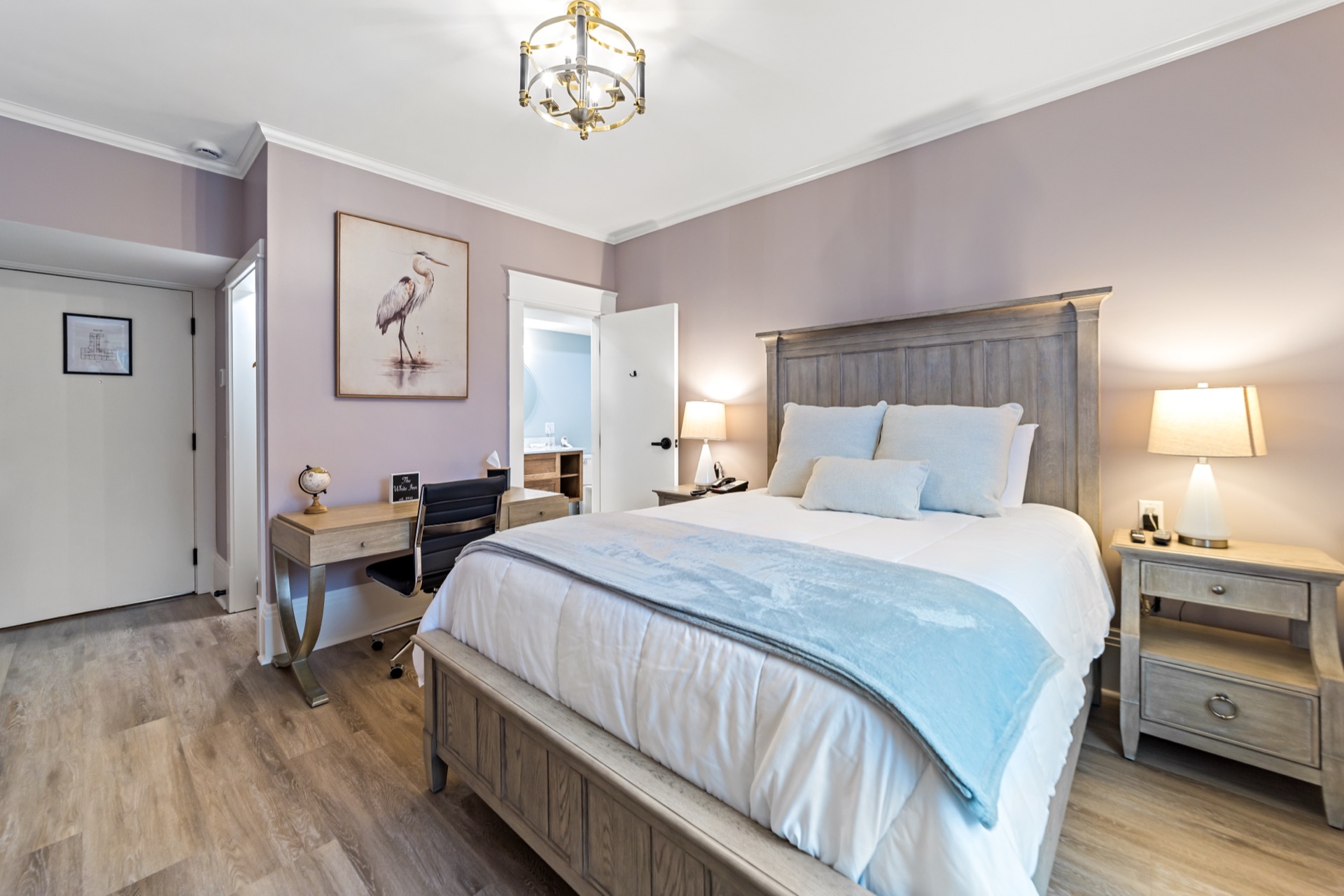 This pet-friendly room showers you with shades of lilac and boasts a queen-sized bed. It also offers ample space to accommodate a crib or rollaway bed for added convenience.