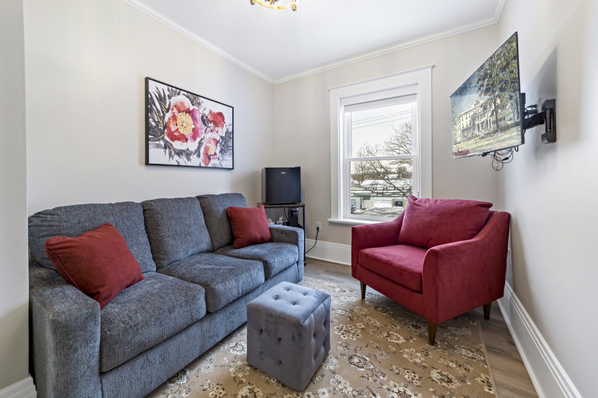 Named in honor of Dr. Squire White's family, this spacious room offers a Queen sized bed alongside a full sized sleeper sofa. This room is also pet friendly for any furry friends that accompany you!